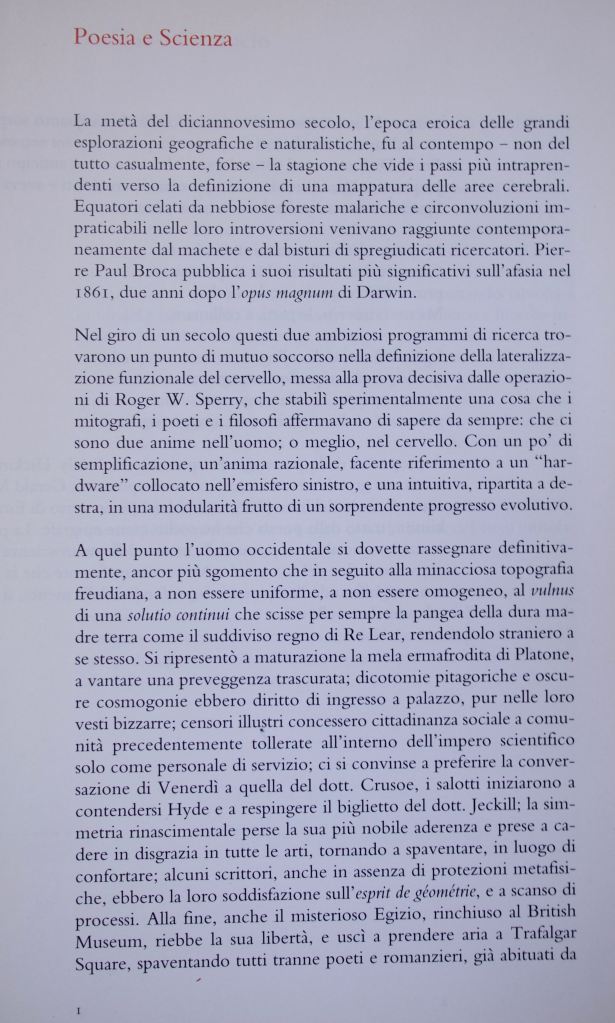 La metà del diciannovesimo secolo, l’epoca eroica delle grandi esplorazioni geografiche e naturalistiche, fu al contempo – non del tutto casualmente, forse – la stagione che vide i passi più intraprendenti verso la definizione di una mappatura delle aree cerebrali. Equatori celati da nebbiose foreste malariche e circonvoluzioni impraticabili nelle loro introversioni venivano raggiunte contemporaneamente dal machete e dal bisturi di spregiudicati ricercatori. Pierre Paul Broca pubblica il suoi risultati più significativi sull’afasia nel 1861, due anni dopo l’opus magnum di Darwin. Nel giro di un secolo questi due ambiziosi programmi di ricerca trovarono un punto di mutuo soccorso nella definizione della lateralizzazione funzionale del cervello, messa alla prova decisiva dalle operazioni di Roger W. Sperry, che stabilì sperimentalmente una cosa che i mitografi, i poeti e i filosofi affermavano di sapere da sempre: che ci sono due anime nell’uomo; o meglio, nel cervello. Con un po’ di semplificazione, un’anima razionale, facente riferimento a un ‘hardware’ collocato nell’emisfero sinistro, e una intuitiva, ripartita a destra, in una modularità frutto di un sorprendente progresso evolutivo.