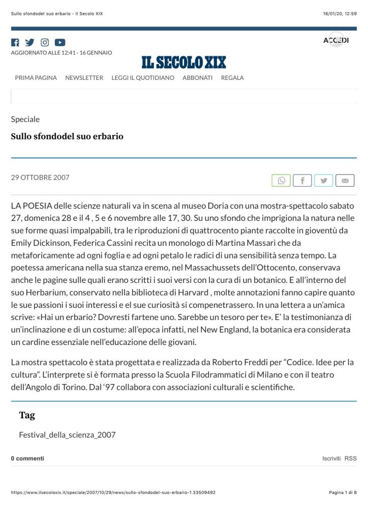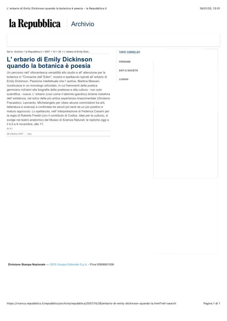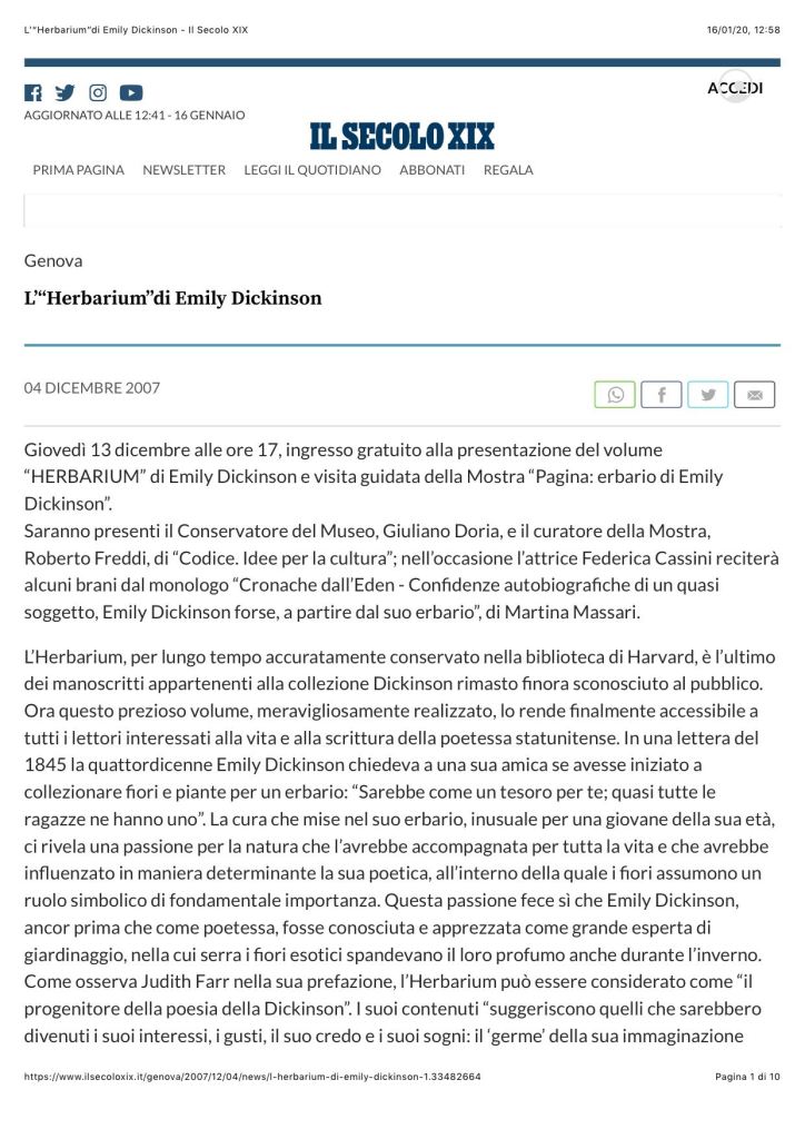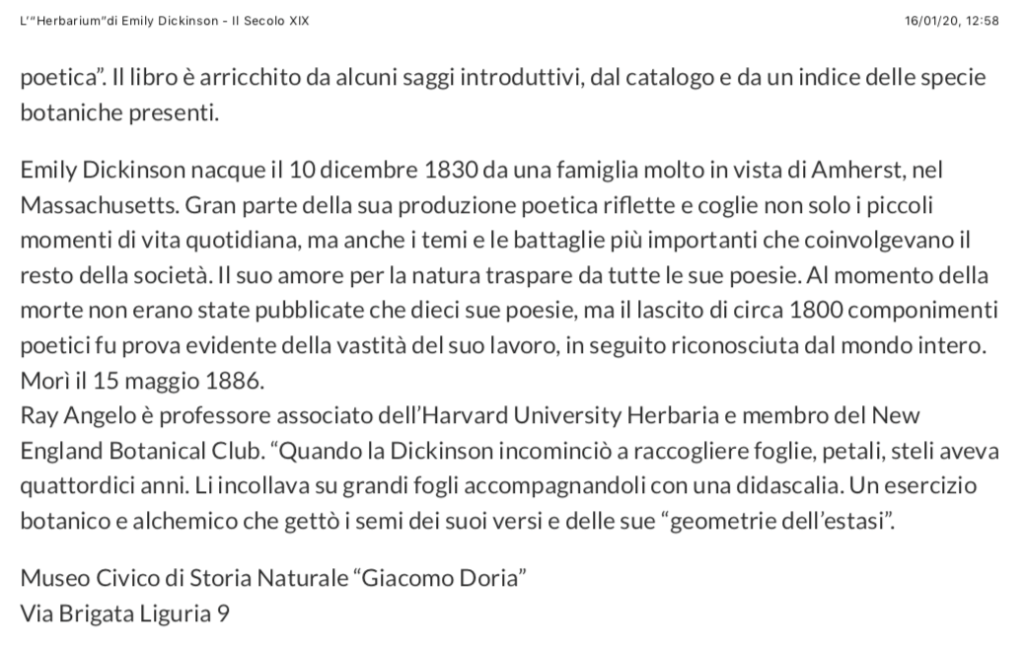Rassegna stampa Il segreto di Emily le poesie nascono dai fiori – la RepubblicaDownload Nel giardino di Emily, dove natura e poesia si intrecciano – Il Secolo XIXDownload Condividi: Fai clic per condividere su X (Si apre in una nuova finestra) X Fai clic per condividere su Facebook (Si apre in una nuova finestra) Facebook Mi piace Caricamento...